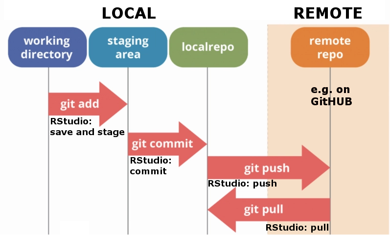 This diagram illustrates a basic workflow for a single user using Git and GitHub for an R project in RStudio. Text in red arrows are the functions used by Git. !! You can just use Git locally, without pushing/publishing to a remote/cloud location such as GitHub